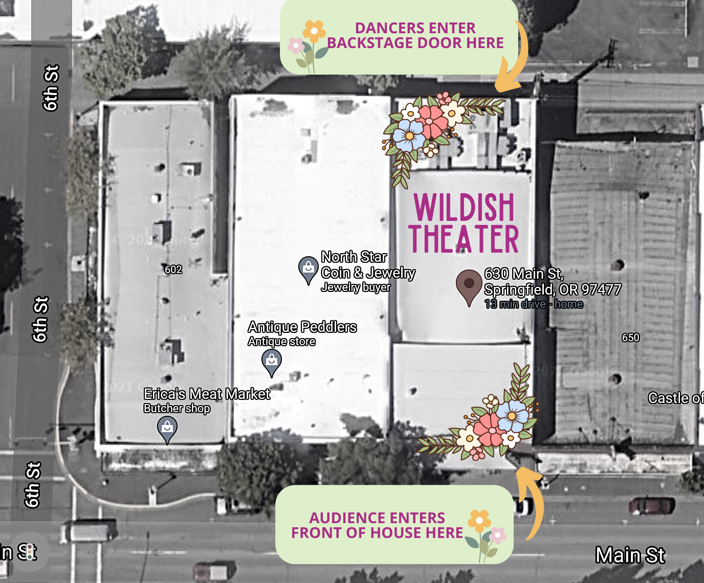 As soon as your dancers is checked in, they will be put with their class and teacher. The dancers will wait with their class while parents are seated in the theatre. After your dancer is checked in, please walk around the building to the front side Main Street entrance to be seated for the show. Dancers will then perform for their parents on stage and be dismissed directly to you from the stage to exit.